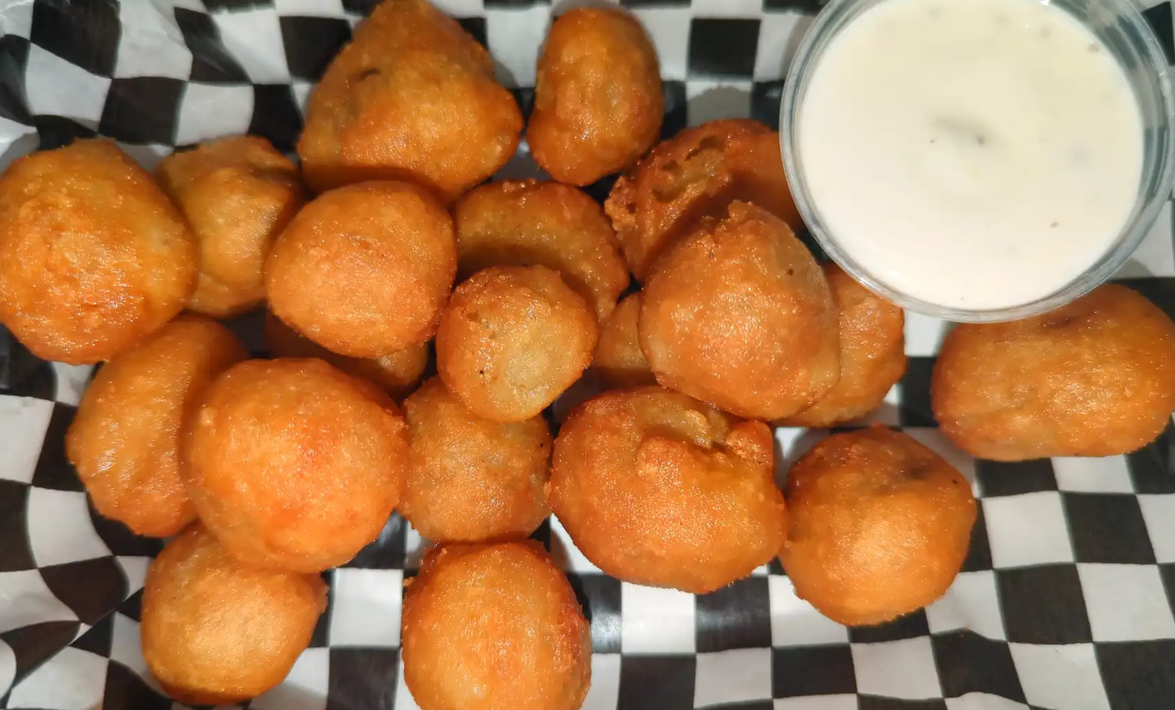 Crispy battered mushrooms served with a side of creamy dipping sauce.