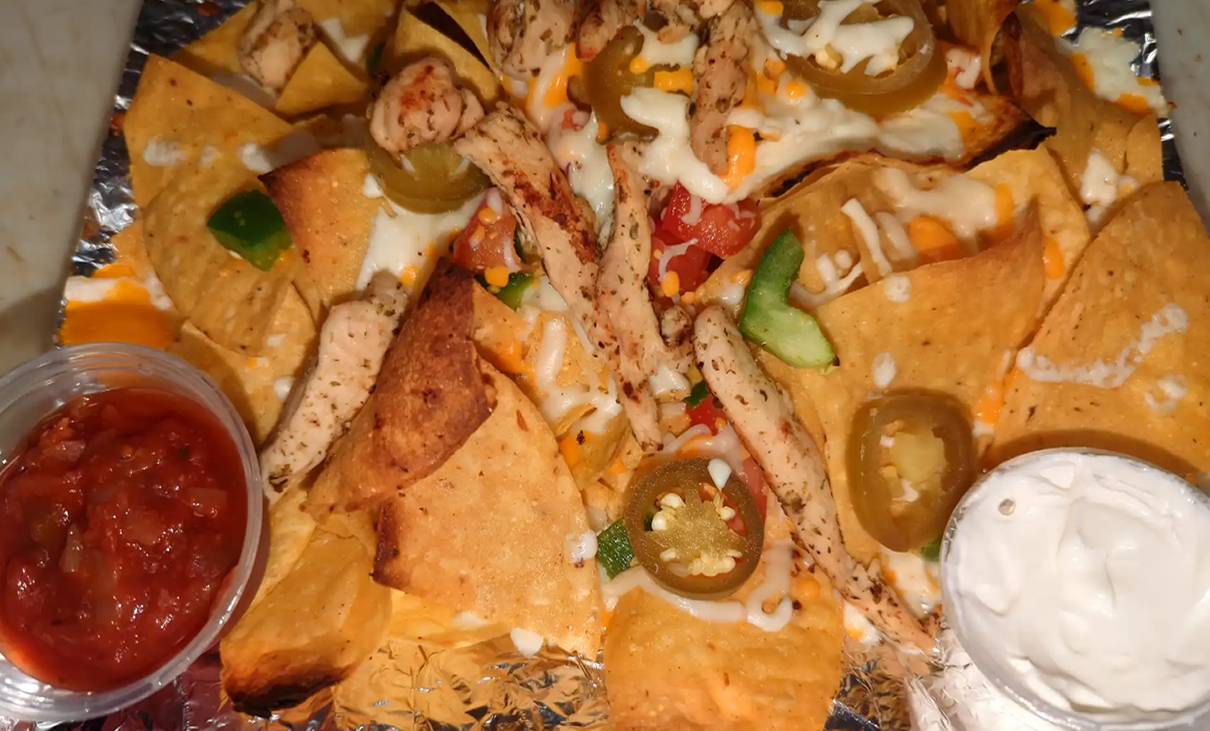 Crispy tortilla chips topped with seasoned chicken strips, melted cheese, jalapenos, and diced green peppers, served with salsa and sour cream.